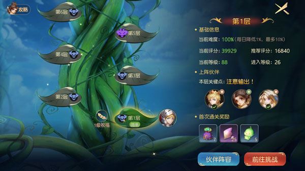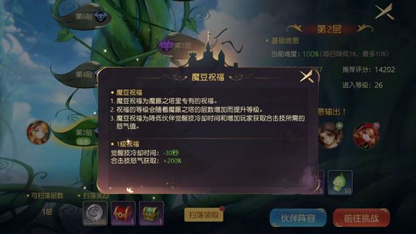 玩家也可以查看面板上的推荐评分。如果对自己的操作有信心,可以挑战更高难度的关卡。而且,魔藤之塔为玩家提供了魔豆祝福,减少觉醒技冷却时间,提升合体技所需怒气值,帮助玩家更好地完成挑战。